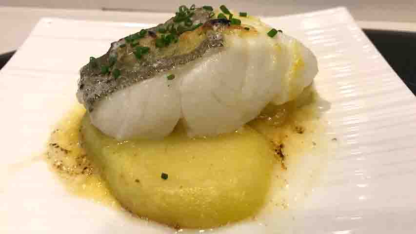 | Tras confitar el bacalao, confita la patata. Sabrás cuando está hecha pinchándola con una puntilla. |